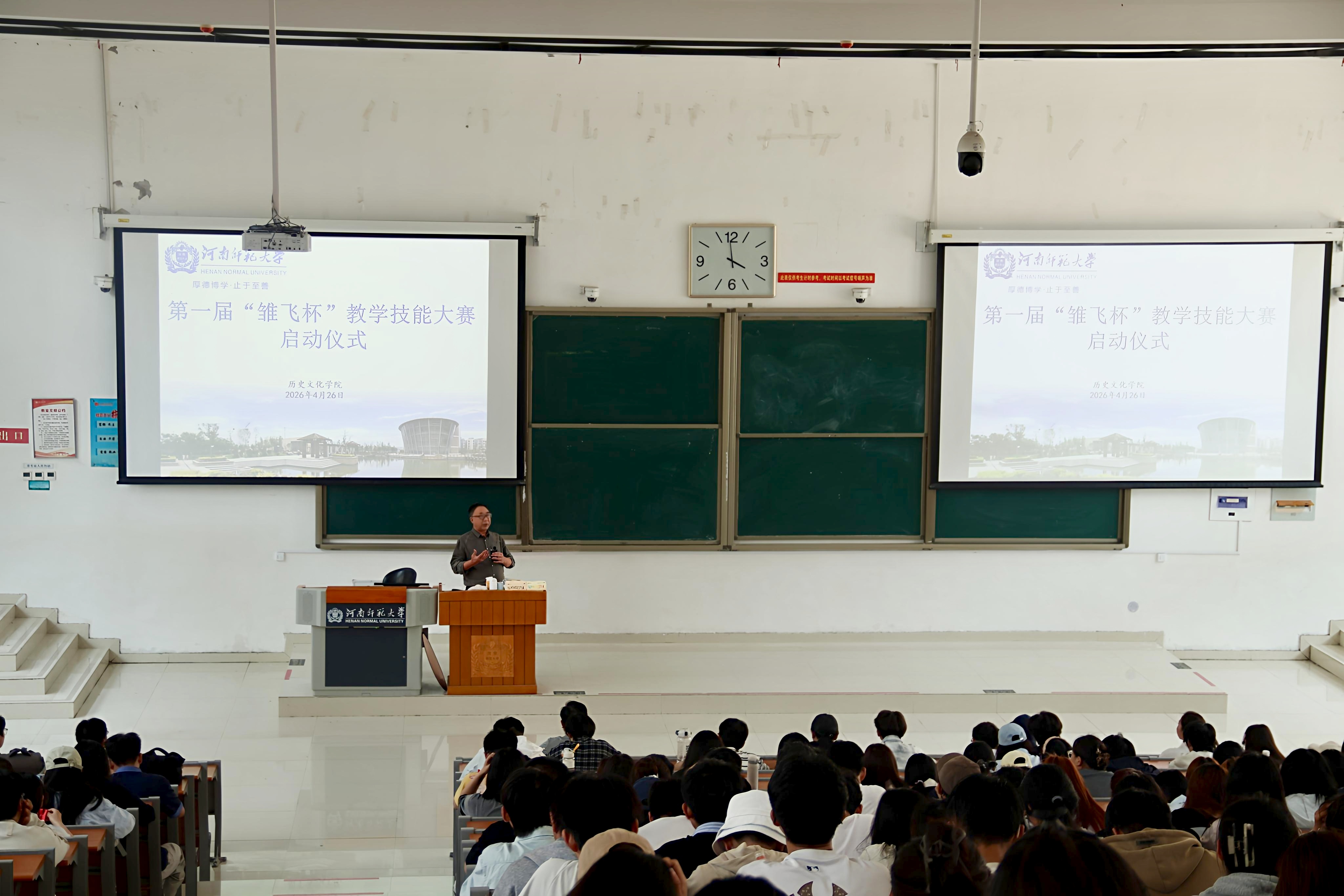 为夯实师范生基本功,锤炼学生教学技能,4月26日下午,历史文化学院第一届“雏飞杯”教学技能大赛启动仪式在文昌楼102教室顺利举行。院长李峰、党委副书记郭委、教学副院长鲍颖建,专业指导教师马小能、乔传宁,往届国家级、省级教学技能大赛选手代表2023级研究生张笑野及2024级全体本科生参加大会,大会由2024级辅导员张文华主持。