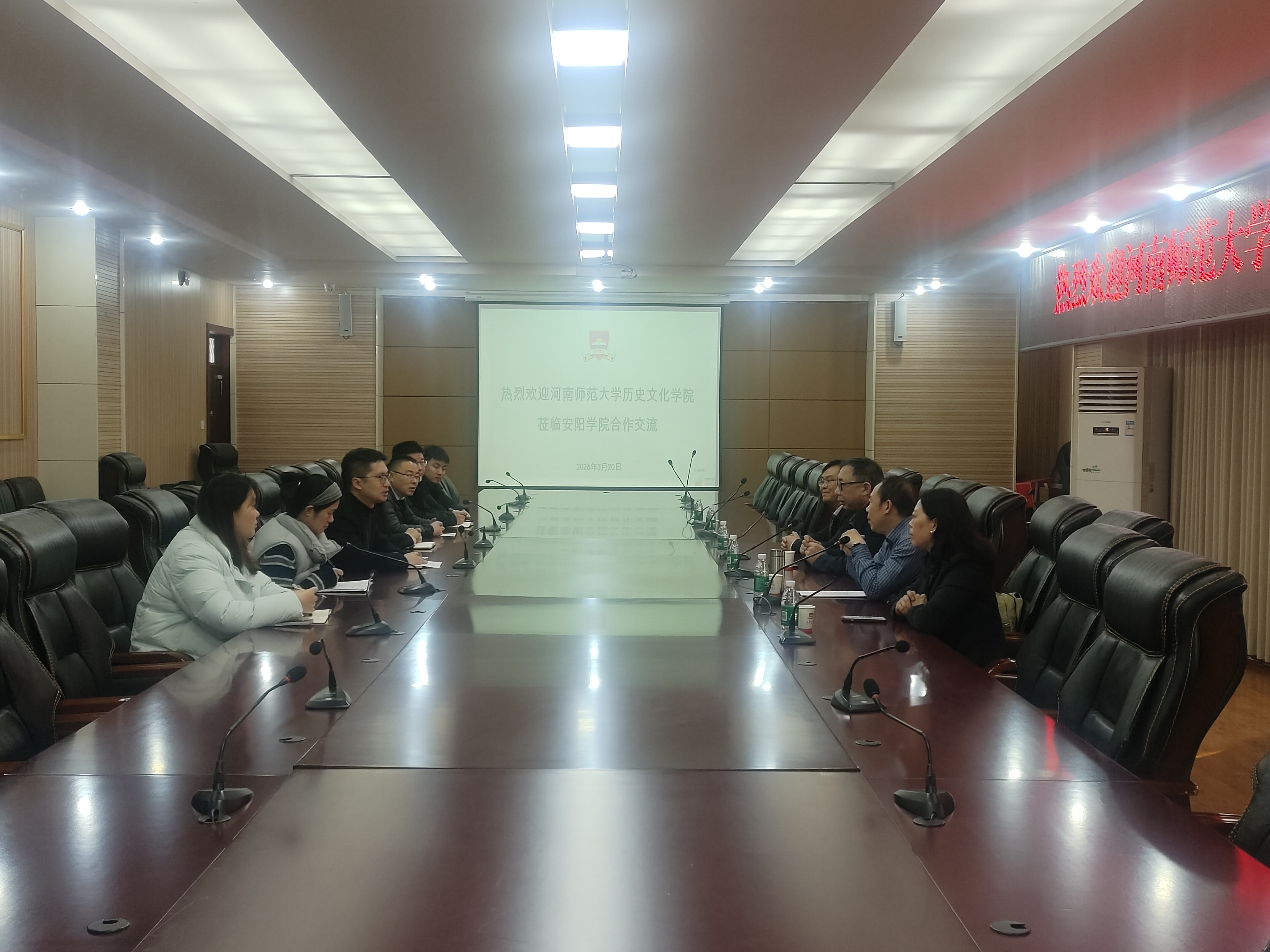 在安阳学院,双方围绕人才培养、学术研究、就业创业等议题展开深入座谈。李峰院长结合历史文化学院的发展规划,详细介绍了学院在学科建设、人才储备、科研特色及人才培养等方面的工作,重点阐述了学院主动对接市场需求、优化育人模式的创新思路。他表示,希望以此次交流为契机,与安阳学院在实习实训基地建设毕业生就业等领域深化务实合作,为学生搭建更多就业创业平台,推动双方在人才培养模式创新、社会服务渠道拓展等方面实现协同发展。安阳学院人事处处长赵广对李峰院长一行的到访表示热烈欢迎,并介绍了安阳学院的办学定位、学科布局及人才需求情况。他高度认可河南师范大学历史文化学院的办学实力和人才培养质量,诚挚邀请学院优秀毕业生到安阳学院就业创业,期待双方在更广阔领域开展深度合作,实现资源共享、优势互补。