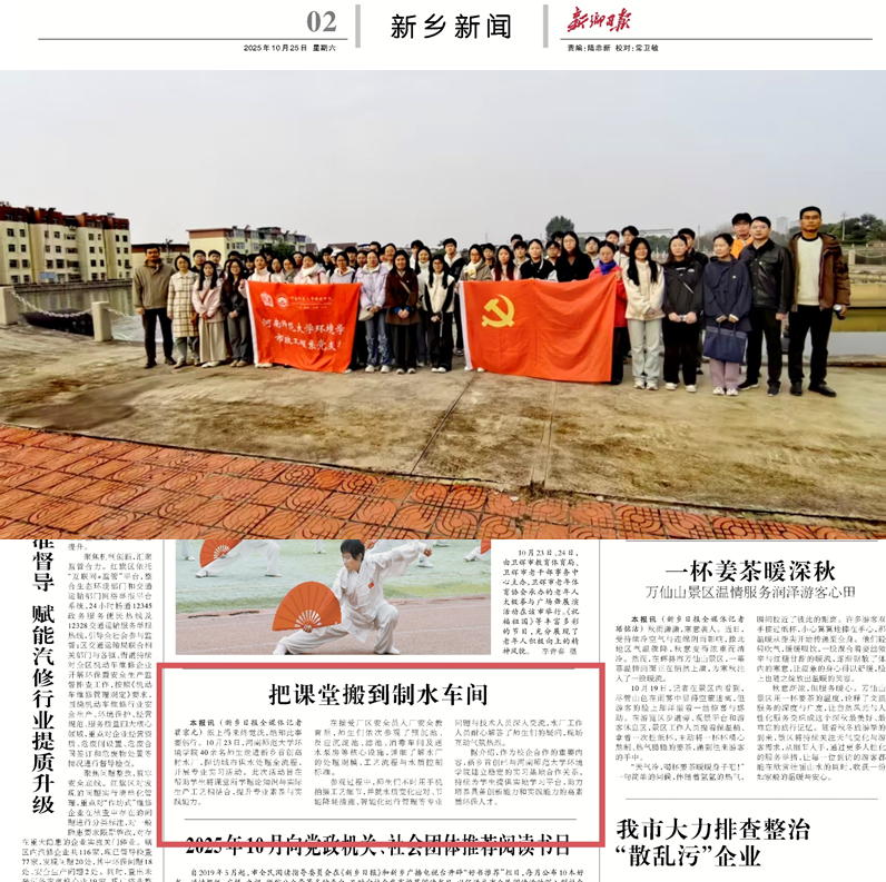 为推动“党建引领实践育人”工作,将红色基因融入专业实践,推动党建与业务深度融合,培育新时代环保人才,为南水北调工程注入青春动能。20251024日,我院市政工程系党支部组织党员教师及给排水专业学生赴新乡市高村水厂,开展“追寻红色水脉,传承匠心使命”主题党日活动。