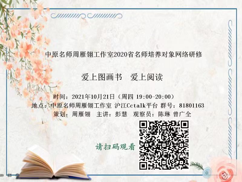 10月21日19:00--20:00,中原名师周雁翎工作室将举办2020省名师培养对象网络研修活动。河南省名师培育对象彭慧老师将就“爱上图画书 爱上阅读”与您分享,欢迎广大师生扫码观看。