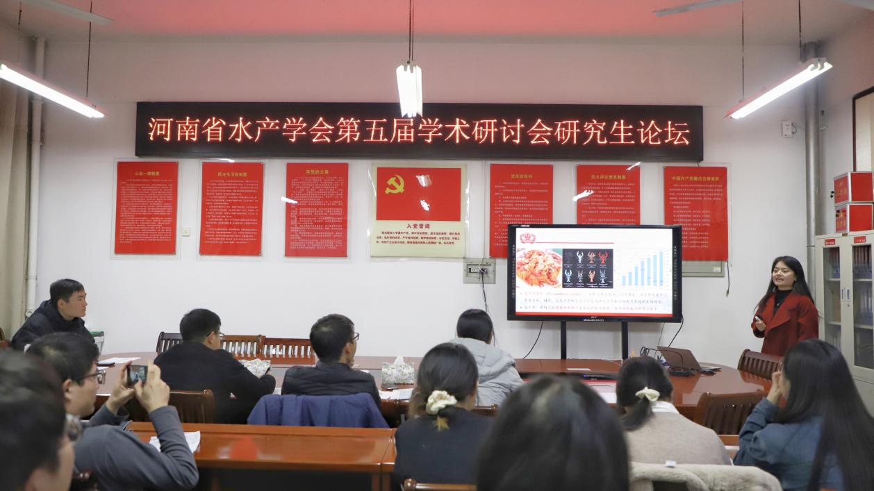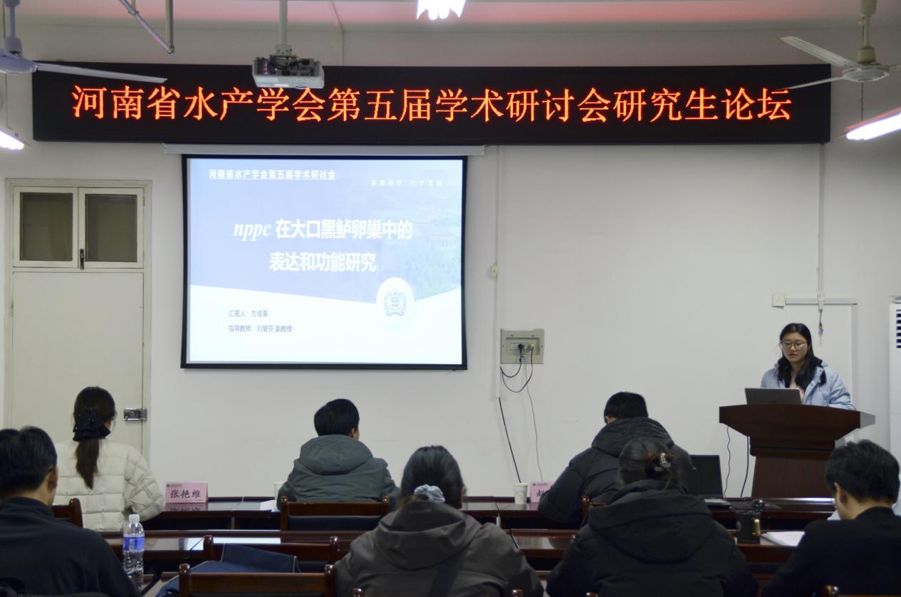 河南师范大学韩立钦教授、信阳农林学院田媛老师及河南浩欣种养殖有限公司于秀亭总经理等11位专家学者就设施渔业、盐碱地养殖、健康养殖鱼精准营养调控等方面作了精彩的报告。大会收集并编录了论文摘要35篇,有23位研究生代表进行了汇报交流,并评选出优秀报告一等奖2人,二等奖4人,三等奖8人。