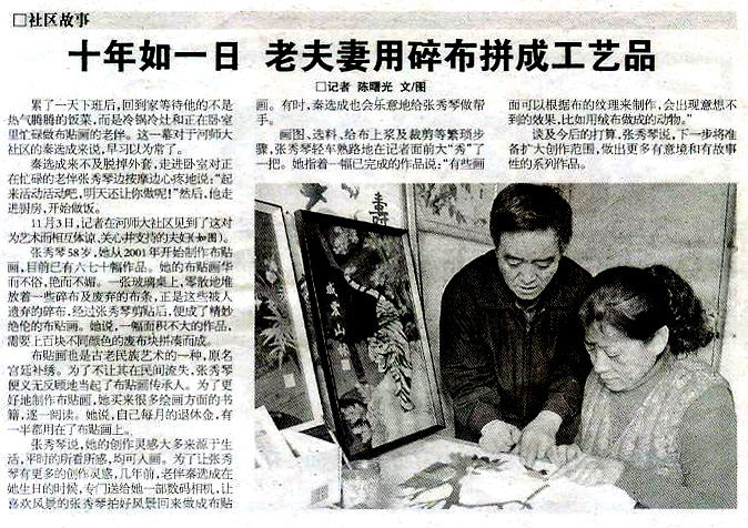 布贴画也是古老民族艺术的一种,原名宫廷补绣。为了不让其在民间流失,张秀琴便义无反顾地当起了布贴画传承人。为了更好地制作布贴画,她买来很多绘画方面的书籍,逐一阅读。她说,自己每月的退休金,有一半都用在了布贴画上。