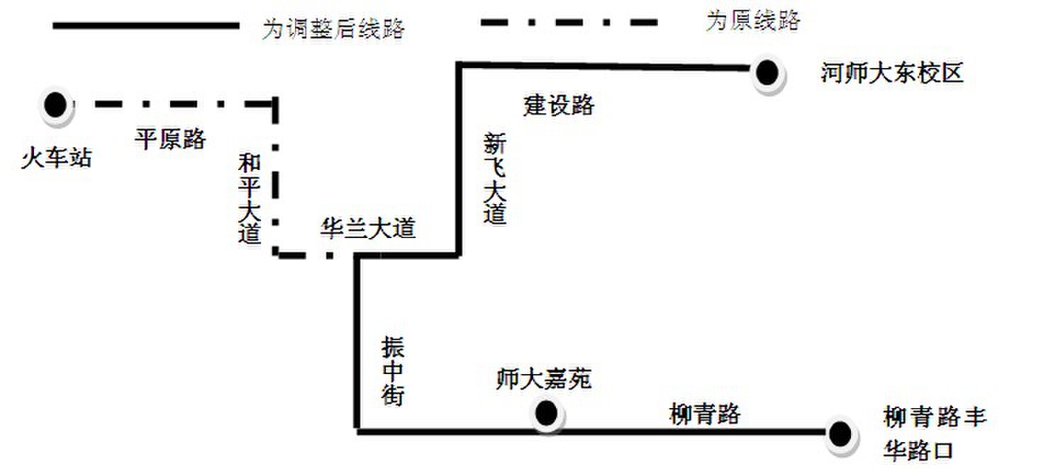 801路由河师大发车原线路不变,行驶至华兰大道振中街口向南行,贯穿振中街,途经南环师大嘉苑,终点是柳青路丰华路口,调整后的发车时间为: