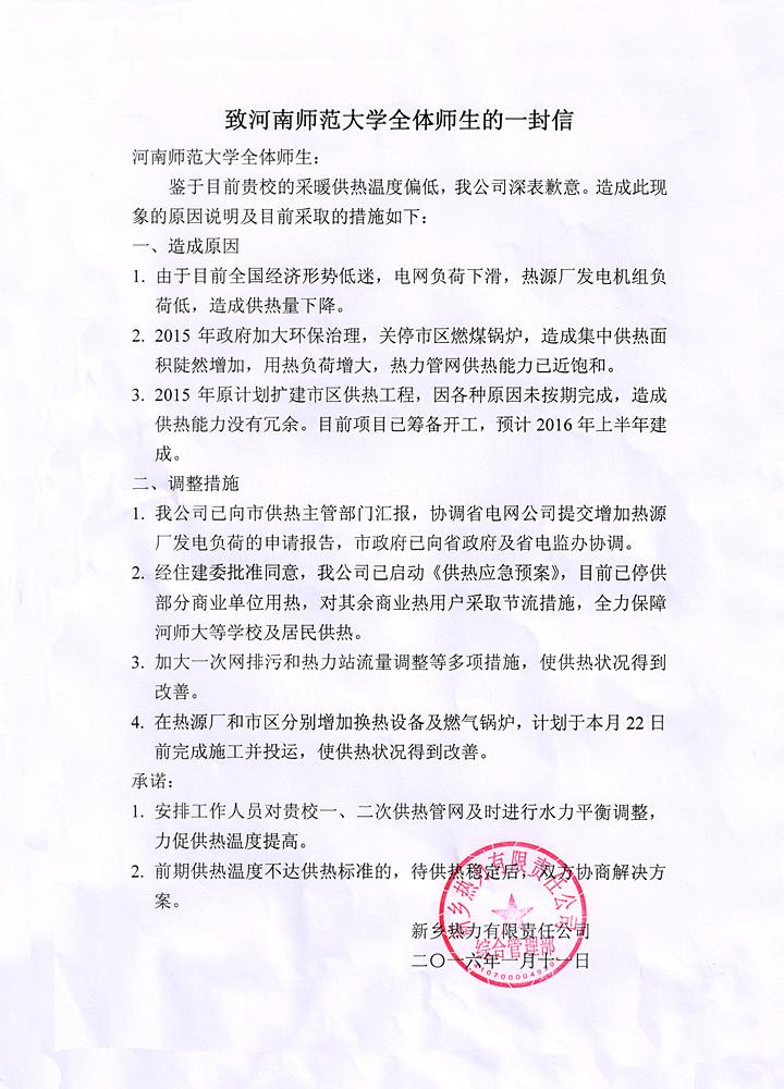 附:新乡热力有限责任公司《致河南师范大学全体师生的一封信》