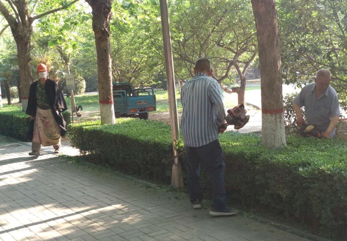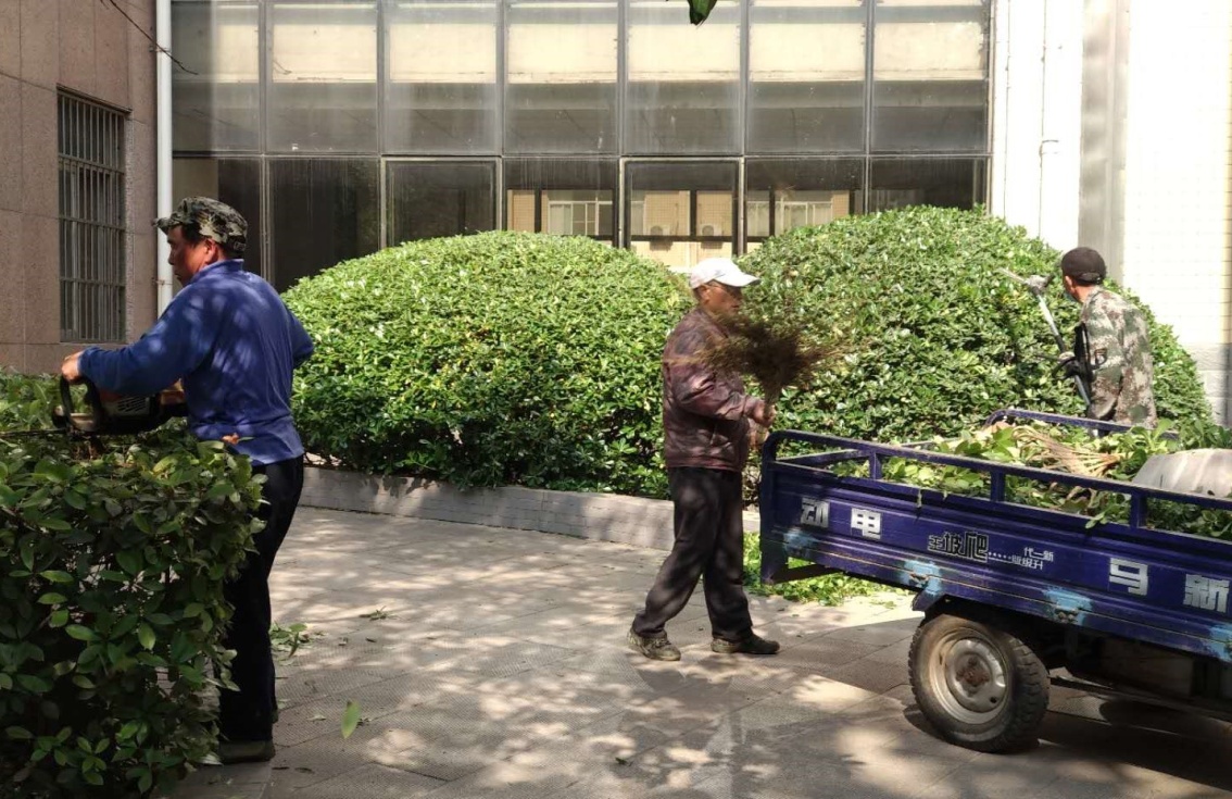 校园中心员工分别在物理北楼、中心花园修剪绿篱