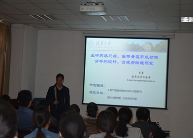 王钊教授作了题为“珠母贝基质蛋白PFMG1促进成骨和防治骨质疏松的研究”的学术报告,从生活中常见的贝壳、珍珠入手,指出珍珠质是一种有机物-无机物复合材料,进而引出PFMG1—合浦珠贝母中的一种可溶性基质蛋白这个概念,随后介绍了PFMG1蛋白的各种功能,如不仅能够在体外促进碳酸钙晶体的聚集,而且可以促进成骨前细胞MC3T3-E1细胞系的成骨分化及胞外基质矿化,同时还可以预防(由卵巢摘除导致的)骨质流失等。巨勇教授从天然产物出发,作了题为“基于天然三萜、甾体骨架有机功能分子的设计、合成与性能研究”的学术报告。报告中详尽地介绍了天然骨架功能分子的自组装机理,重点介绍了有机凝胶及其应用,以及在不同的分子构型、多样化特异性结合位点、新型模式及生物体内应用的展望。两位教授的报告观点新、内容实、讲解细,令在场师生受益匪浅。会后,两位专家同与会师生进行了互动交流。