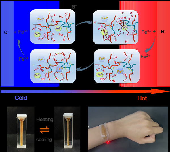 随着可穿戴电子设备的快速发展,可持续能源供应成为实现双碳目标的关键挑战之一。环境中的低品位热能,如体热、太阳能热和工业废热,具有巨大的热电转换潜力。然而,传统半导体热电材料存在热电势低、脆性高和制备工艺复杂等局限。近年来,准固态离子热电材料因其柔性、仿生离子传导等特性受到关注,但其实际应用仍受限于低热电势,往往需要复杂的电压放大或级联电路,导致成本高昂且效率不足。该研究开发出一种温度响应性超分子水凝胶(PNA)作为离子热电电池的关键材料通过离子交联及氢键作用赋予PNA水凝胶优越的机械性能。氢键网络为离子迁移提供了高效通道,而相变过程中氢键的减弱与羧基水合作用增强则进一步促进了离子熵差的形成,从而显著提升离子热扩散速率。相变过程中羧基与铁离子的选择性配位扩大了氧化还原对的熵差,进一步提升热电离子的氧化还原反应效率。当温度超过临界点后,塞贝克系数由15.6跃升至40.9毫伏每开尔文,实现了热电转换效率的倍增PNA热电池的制备过程简单、快速,且无需使用不可降解的化学交联剂,综合性能优越。这项研究利用内在固有的体积相变行为和配位理论的协同作用,为开发高性能、低成本离子热电材料提供了新路径。
