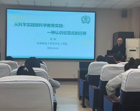 为加强学术交流,提升我院化学教育类研究生的培养质量,2025年10月14日,华中师范大学化学学院教授、博士生导师,中国教育学会教育学分会课程学术委员会常务理事邓阳教授应邀为我院师生作题为《从科学实践到科学教育实践:一种认识论范式的迁移》的学术报告。本次报告由李猛老师主持,化学教育研究所教师、硕士研究生及部分本科生参加。