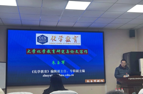 20251114日上午,核心期刊《化学教育》专职副主编、编辑部主任朱玉军博士应邀为我作题为《大学化学教育研究与论文写作》的专题讲座。讲座由赵茜怡院长主持,广大师生积极参加并展开深入交流