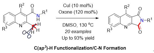 25. Yan, X.; Zhang, Z.;* Zhang, G.;* Ma, N.; Liu, Q.; Liu, T.; Shi, L. Copper(I)-catalysed amidation and successive oxidation of benzylic C(sp3)–H bond: synthesis of 1H-pyrrolo[3,4-b]quinoline-1,3(2H)-diones. Tetrahedron, 2016, 72, 4245-4251. https://doi.org/10.1016/j.tet.2016.05.059
