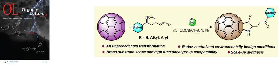 19. Jinliang Ma, Tong-Xin Liu,* Pengling Zhang, Chuanjie Zhang, Guisheng Zhang* Palladium-catalyzed domino spirocyclization of [60]fullerene: synthesis of diverse [60]fullerene-fused spiro[4,5] /[5,5] derivatives Chem. Commun., 2021, 57, 49−52. • Selected as the Inside Front Cover • Highlighted by X-MOL • Highlighted by RSC China 18. Conghui Wu, Tong-Xin Liu,* Pengling Zhang, Xue Zhu, Guisheng Zhang* Iron-Catalyzed Redox-Neutral Radical Cascade Reaction of [60]Fullerene with γ,δ-Unsaturated Oxime Esters: Preparation of Free (N–H) Pyrrolidino[2¢,3¢:1,2]fullerenes Org. Lett., 2020, 22, 7327−7332. • Highlighted by CBG News