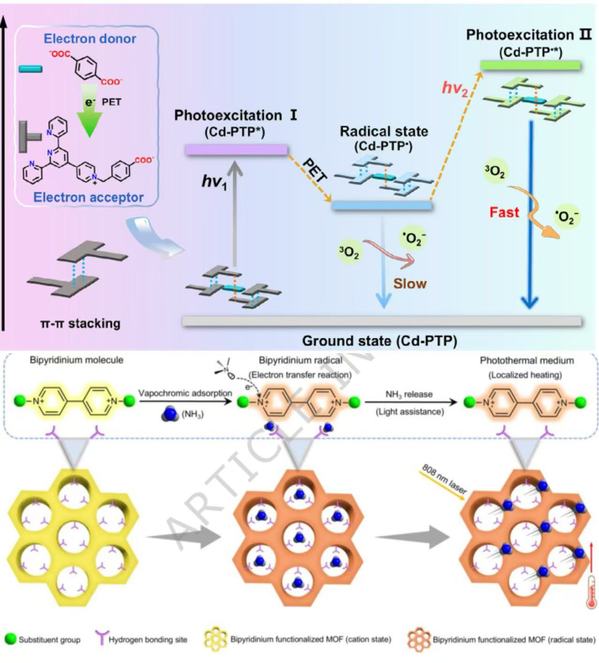 氨气作为一种重要的工业与农业原料,兼具毒性和腐蚀性,其高效捕获、检测一直是行业难题。传统金属-有机框架材料在吸附氨气后需要高温真空处理才能脱附,能耗高,制约了其工业应用潜力。针对这一挑战,该研究团队开发了一种新型联吡啶鎓功能化金属-有机框架氨气吸附剂,合成方法简单,能实现克级规模化生产,为工业应用奠定了基础。该材料孔道内富含未配位的羧酸氧原子,可作为氢键位点高效捕获氨气分子,赋予其快速响应和低检测限的氨气检测性能。另外,形成的自由基态产物具有优异的光热性能。在808 nm的激光照射下,可快速升温至121 °C,光热转换效率高达80.75%。这种局部光热效应能够有效破坏氢键作用,实现氨气分子的可控释放,远优于传统加热脱附方式。另外,该吸附材料还具备优异的稳定性,在多次吸附-脱附循环测试后,其性能无明显下降。