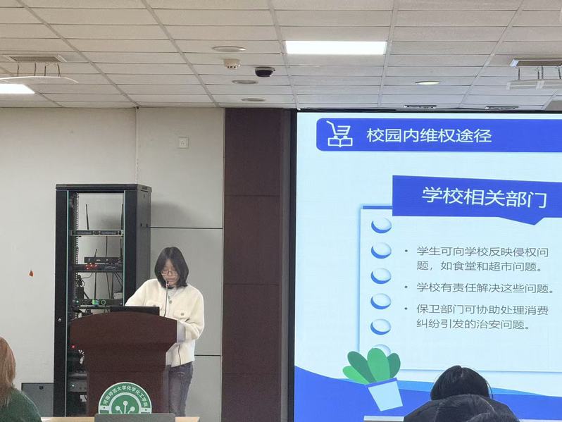 活动伊始,主持人阐明了活动将消费者权益保护与绿色消费理念结合的核心内涵,接着总结了央视3·15晚会曝光的食品安全问题,包括不法商家使用双氧水漂白泡发鸡爪、网红辣条超量使用工业级防腐剂等乱象,让同学们直观认识当前市场的消费隐患。随后的科普环节,主持人围绕消费维权与绿色消费展开讲解,既介绍了12315投诉平台等维权方法,也强调绿色消费不仅是生态保护需求,更是保障自身消费安全的重要方式。科普结束后,现场播放维权典型案例与绿色消费科普短片,直观剖析不良消费行为的危害。在互动讨论环节,同学们积极分享自身网购、线下消费中遇到的消费问题及维权尝试,交流绿色低碳的消费方式与生活经验,现场氛围热烈。最后,全体同学共同作出“理性消费、依法维权、绿色低碳、践行环保”的郑重承诺,活动圆满落幕。