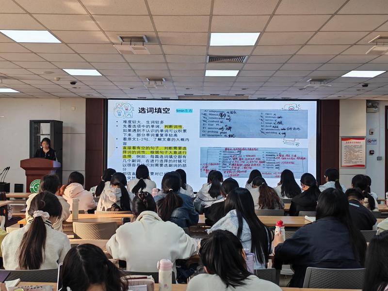 分享会上,徐艺洋首先从词汇积累、真题练习等基础环节入手,推荐实用背词软件,提出“碎片时间定量背词”“只刷真题不做模拟”等实用方法,强调词汇是所有技巧的根基。随后,她详细拆解了阅读三大题型、写作和翻译的时间分配与答题策略,针对选词填空、段落匹配、仔细阅读分别给出针对性解题方法。同时分享写作列提纲、翻译拆分长句等实用技巧,帮助同学们掌握高效解题节奏。最后,她结合自身备考经历鼓励大家科学备考、树立信心,不盲目攀比进度。在互动环节中,同学们踊跃提问,徐艺洋就做题顺序,词汇积累等实际问题进行细致解答,为同学们提供了清晰的备考思路与实用的应试技巧。