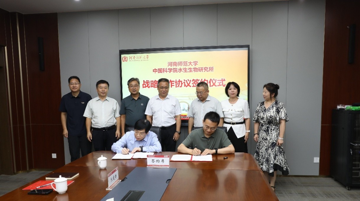 郭海明、缪炜代表双方签署了《河南师范大学与中国科学院水生生物研究所战略合作协议》。签约仪式后举行水生所协办我校水产专业40周年致谢活动,聂国兴回顾了中科院水生所协办我校水产专业办学40年以来双方的友好合作历程并宣读致谢函。他深情谈到上世纪80年代,我校水产专业面临师资匮乏、课程体系空白、实验条件简陋等严峻挑战。1985年,时任我校水产教研室主任单元勋教授慕名远赴荆楚,寻求协助;水生所原所长刘建康院士、时任副所长潘金培研究员鼎力相助。1986年至1988年,水生所学科先贤胸怀科教兴国之志,以无私的学术担当组建精锐教学团队奔赴中原。潘金培、陈英鸿、李连祥、王伟俊、谢杏人、徐伯亥、吴清江、朱心玲、伍惠生、杨兴棋、蒋一珪、姚卫建等知名专家学者来到我校,为初创的水产专业秉烛引路,播撒希望。三年间,他们风雨无阻来校讲授《鱼类学》《池塘养鱼学》《鱼类遗传育种学》《淡水生态学》等核心课程,承担超过85%的专业课程。在此期间,我校师生参与了水生所首条“转基因鲤”的研制工作。2011年秋,水生所曹文宣院士、桂建芳院士、殷战研究员、崔宗斌研究员来校擘画水产学科十年规划蓝图,为学科长远发展夯基垒台、立柱架梁。四十年来,在水生所的关怀帮助下,我校水产专业抽枝展叶、葳蕤生光;水产学科奋楫启碇、破浪前行。希望以此次战略合作为契机,在人才培养、课程建设、科研合作和社会服务等方面与中科院水生所深入合作,助力中原渔业转型升级和绿色高质量发展。