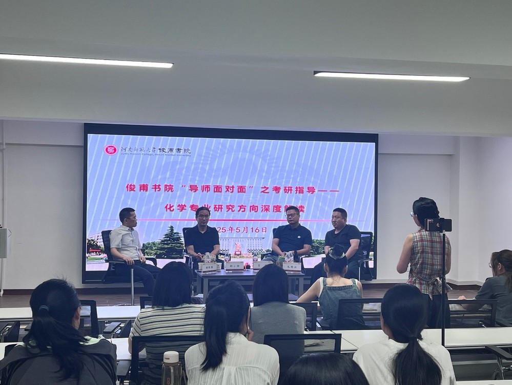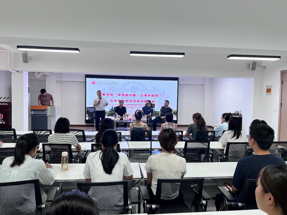 活动中,四位导师结合学科发展动态与学生关切问题展开专业解读。轩小朋聚焦物理化学领域,从热力学、电化学、表面催化等方向切入,剖析其核心研究内容与基础理论要求。常毅以功能材料、纳米催化等前沿案例为引,系统阐述无机化学的研究范畴与产业化前景。毛国江则从分析化学的学科交叉性出发,解读其在环境监测、生物医药等领域的实际应用,并对其与材料化学、生物化学的协同创新潜力进行了说明。谢明胜结合有机化学领域近年热点,如不对称合成、金属有机框架材料等,解析学科特点及国际研究趋势,并对未来发展前景进行了简要介绍。