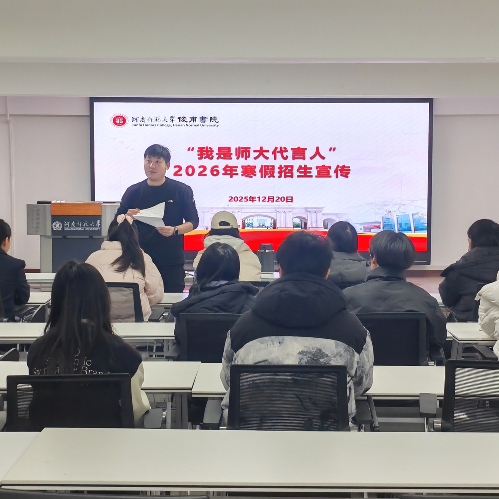 为深化实践育人成效,助力学校招生工作高质量推进, 12月20日上午,河南师范大学俊甫书院在东十“一站式”学生社区111教室成功开展“师大代言人”寒假招生宣传社会实践团队选拔工作。本次活动旨在选拔一批熟悉校情校史、表达能力强的学生团队,利用寒假返乡机会开展招生宣讲,全面展示我校的办学特色和校园文化。