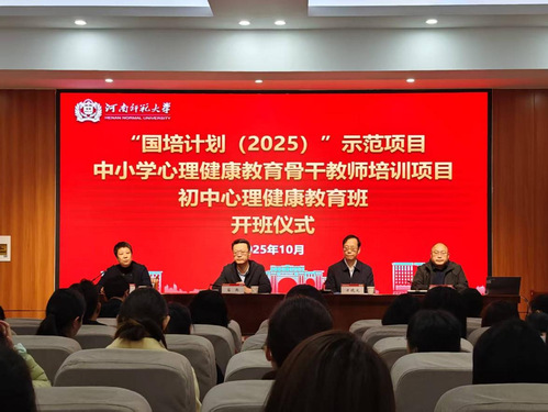 10月10日上午,2025年“国培计划”示范项目中小学心理健康骨干教师培训项目初中心理健康教师班在我校举行开班仪式,学校党委常委、副校长苗雨,北京师范大学心理学部教授方晓义,以及我校教育学部、继续教育学院相关负责人出席开班仪式,来自全国的50名初中心理健康骨干教师参加本次培训。仪式由继续教育学院院长李津主持。