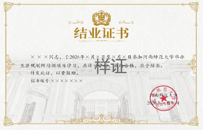 4.证书颁发:参训学员完成全部课程学习且考核合格后,颁发河南师范大学“中学生生涯规划师研修班”结业证书。