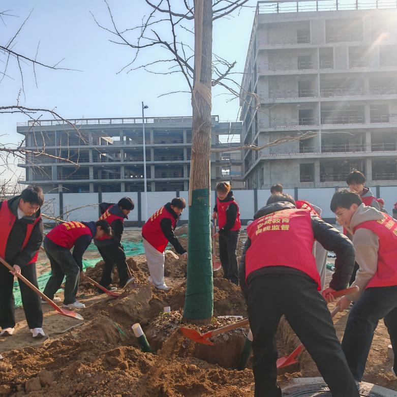 植树现场,在专业技术人员指导下,师生手持铁锹、水桶等工具,分工明确、协作默契,完成挖坑铲土、扶苗培土、新苗浇灌等环节,全程井然有序、高效推进,师生们热情高涨、干劲十足;劳动间隙,师生亲切交流,详细了解学生在创新港校区的学习生活情况,鼓励学生主动参与各项劳动教育实践活动,深度融入校区建设。随着一棵棵银杏树拔地而起,校园银杏大道初见规模。