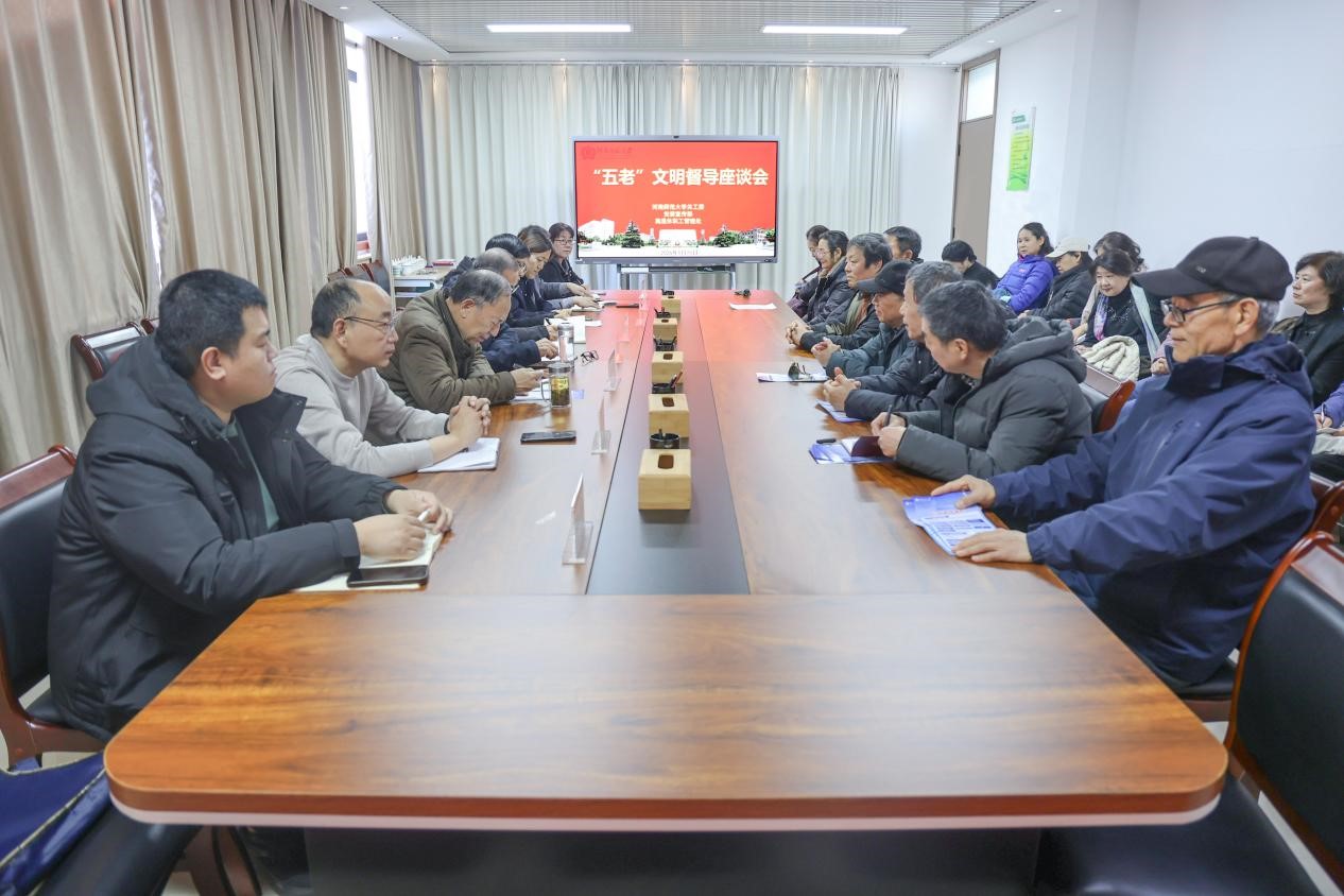 1月15日下午,“五老”文明督导座谈会在离退休职工管理处会议室举行。校关工委、党委宣传部、离退休职工管理处有关负责人及“五老”精神文明督导队全体成员参加。座谈会由离退休职工党委书记华锋主持。