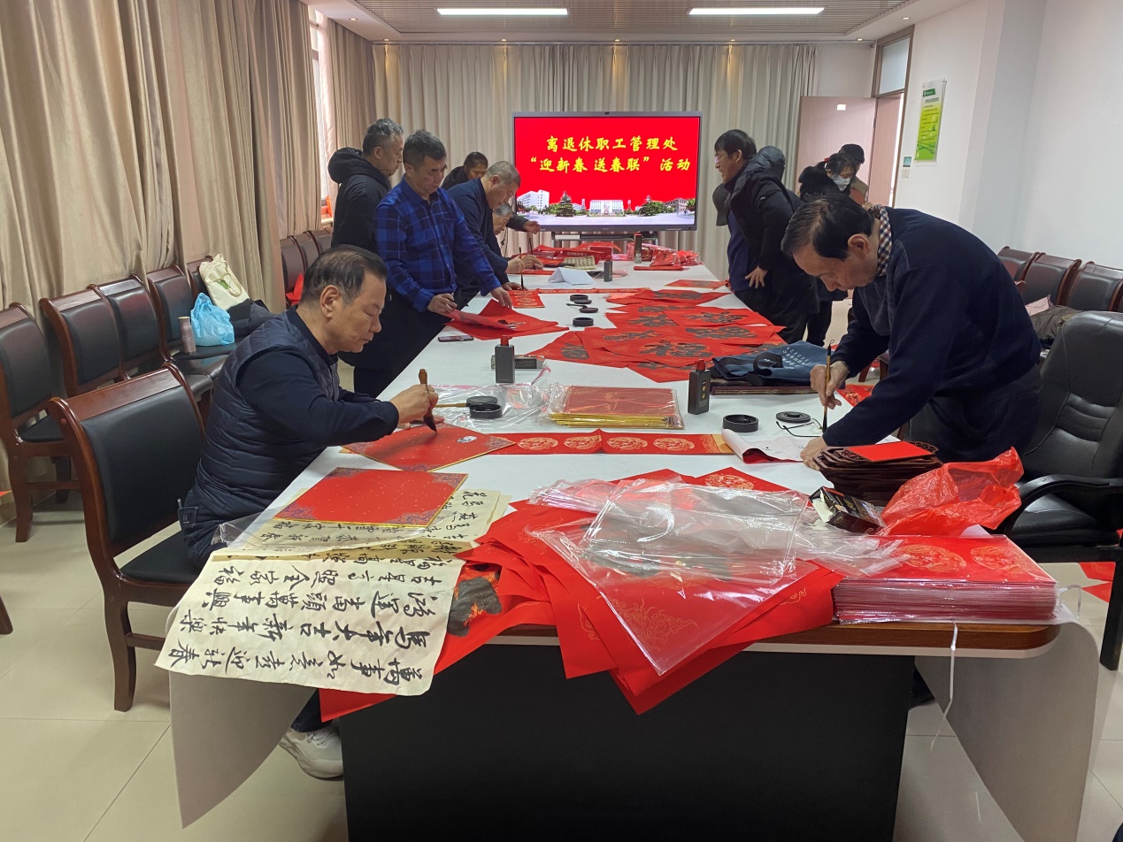 1月28日上午,离退休职工管理处在群体楼四楼党员活动室举办“迎新春 送春联”活动。活动特邀老年书画院书法老师现场挥毫,为老同志们书写春联、福字,送上诚挚的新春祝福。