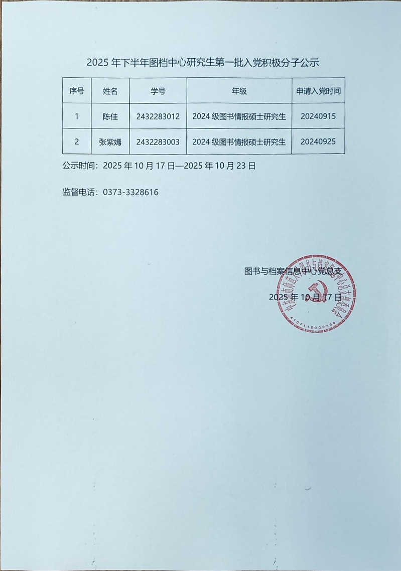 2025年下半年图档中心研究生第一批入党积极分子公示
