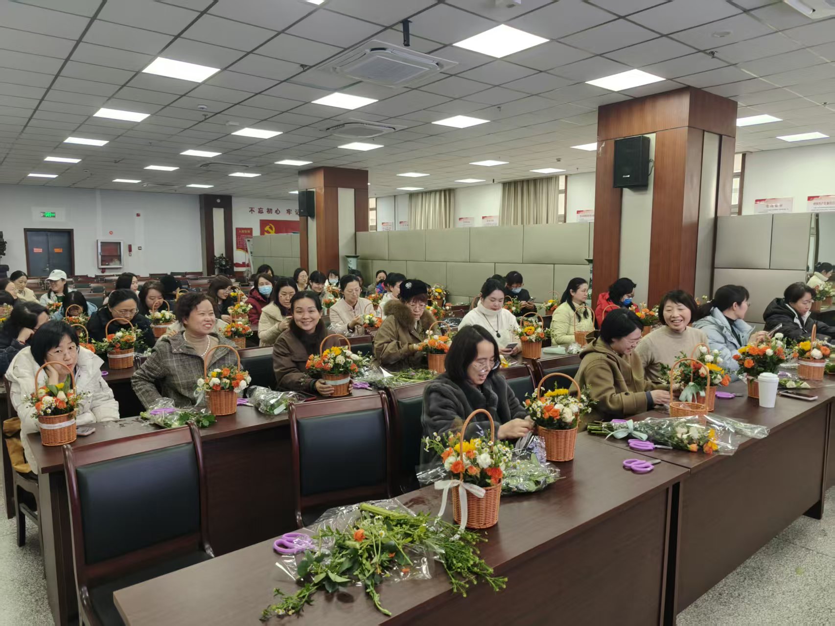 活动现场花香四溢,笑语盈盈。专业花艺师首先为大家讲解了花卉品种、色彩搭配与造型技法等基本知识,并演示了插花步骤与技巧。在轻松愉快的氛围中,女教职工们巧手修剪、精心构思,各色花卉搭配成一件件生机盎然的插花作品。作品完成后,大家纷纷展示创作成果,并合影留念。