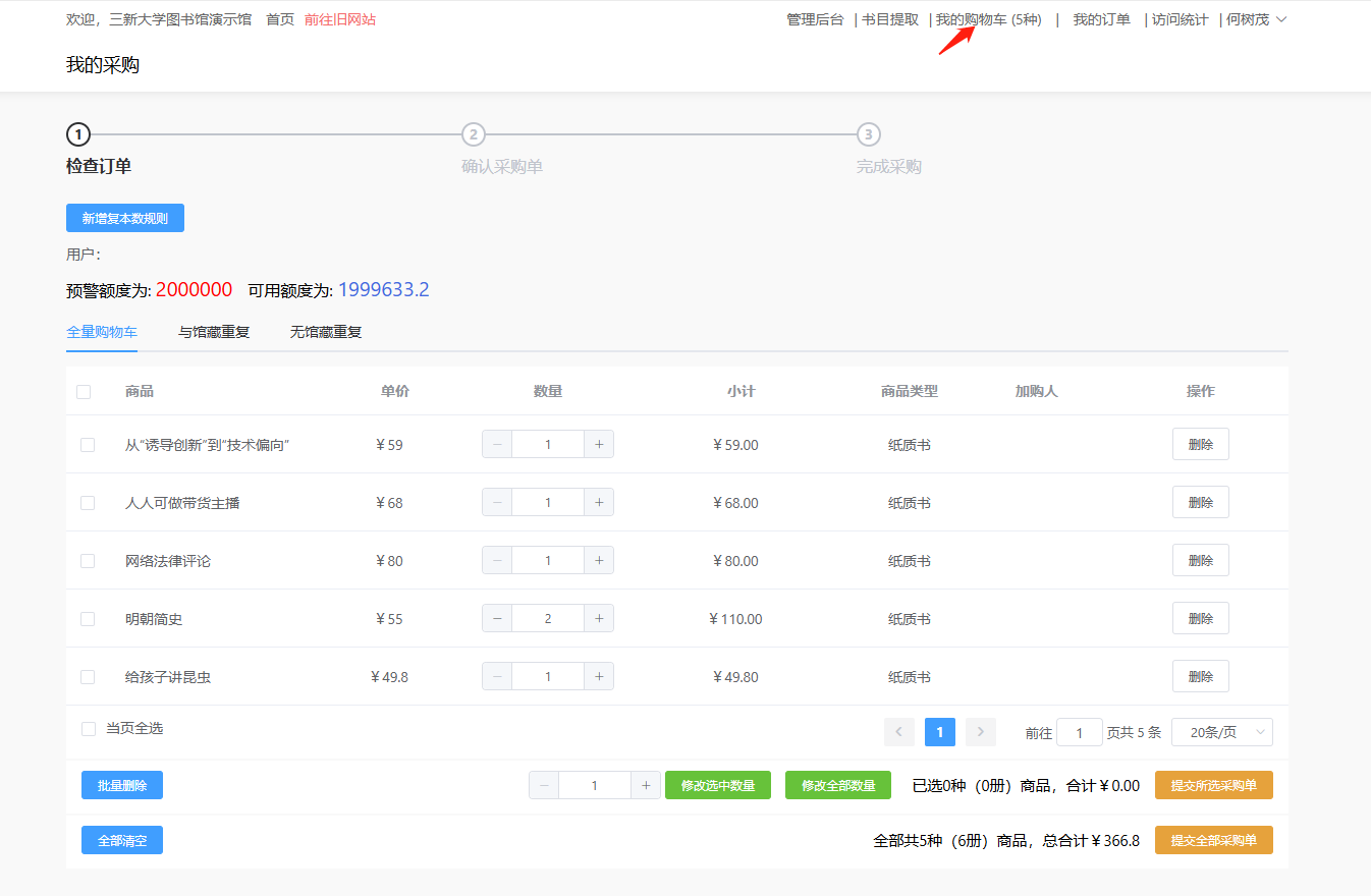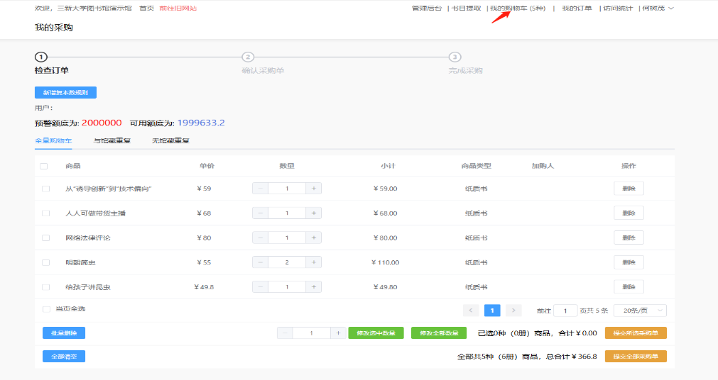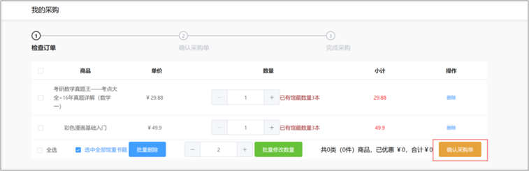 (3)确认采购单:✔全选,点击确认采购单,即可完成线上选购。
