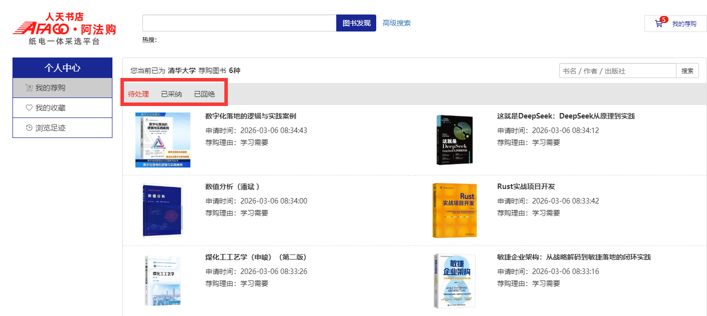 3.我的荐购:【个人中心】→【我的荐购】中可查看到所有的荐购书目,及图书馆的采纳情况。