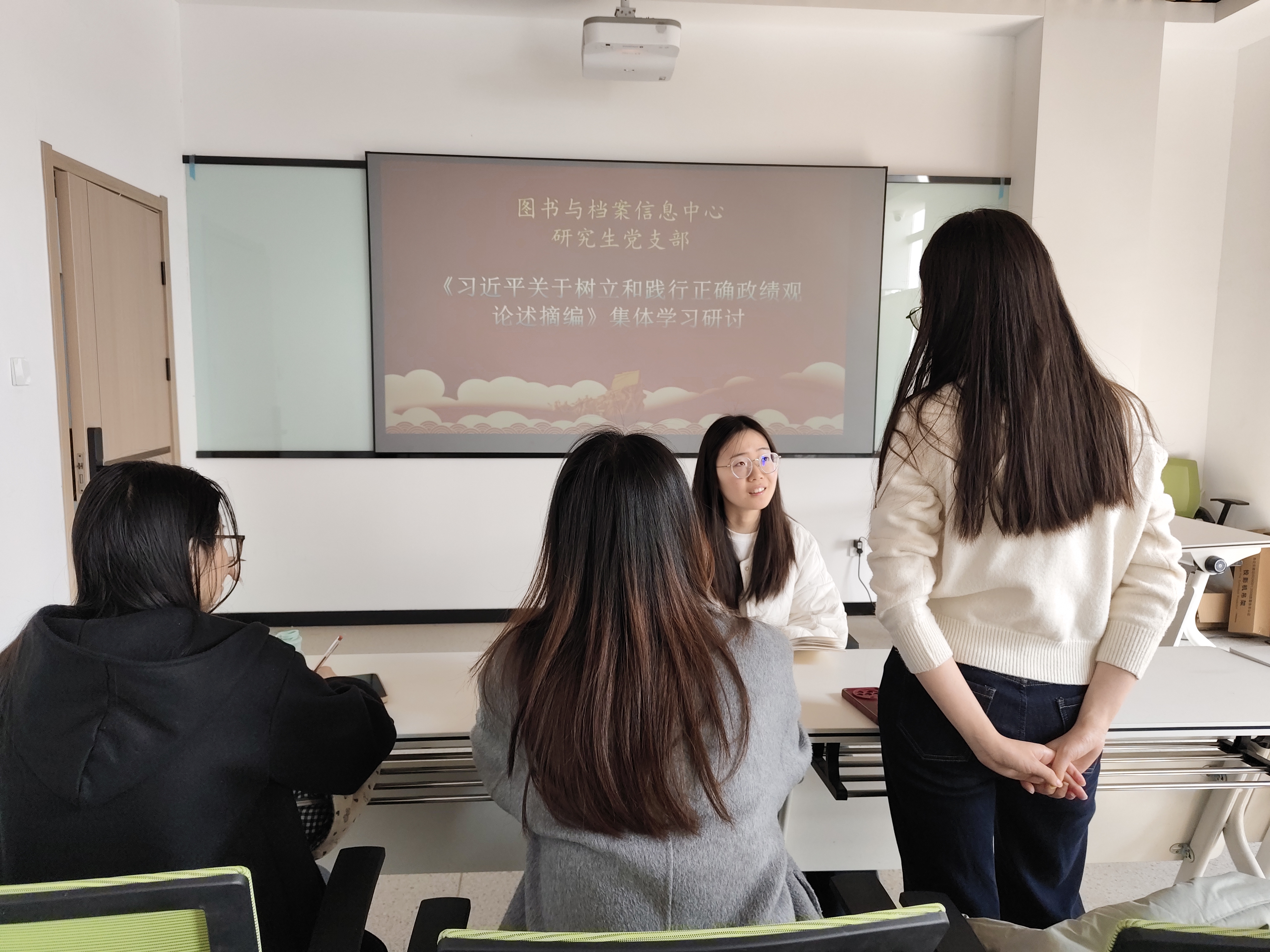 3月20日下午,图情专硕研究生党支部在图书馆803研究生教室召开专题党会,围绕《习近平关于树立和践行正确政绩观论述摘编》开展学习研讨。会议由支部组织委员、2025级研究生任子涵主持。