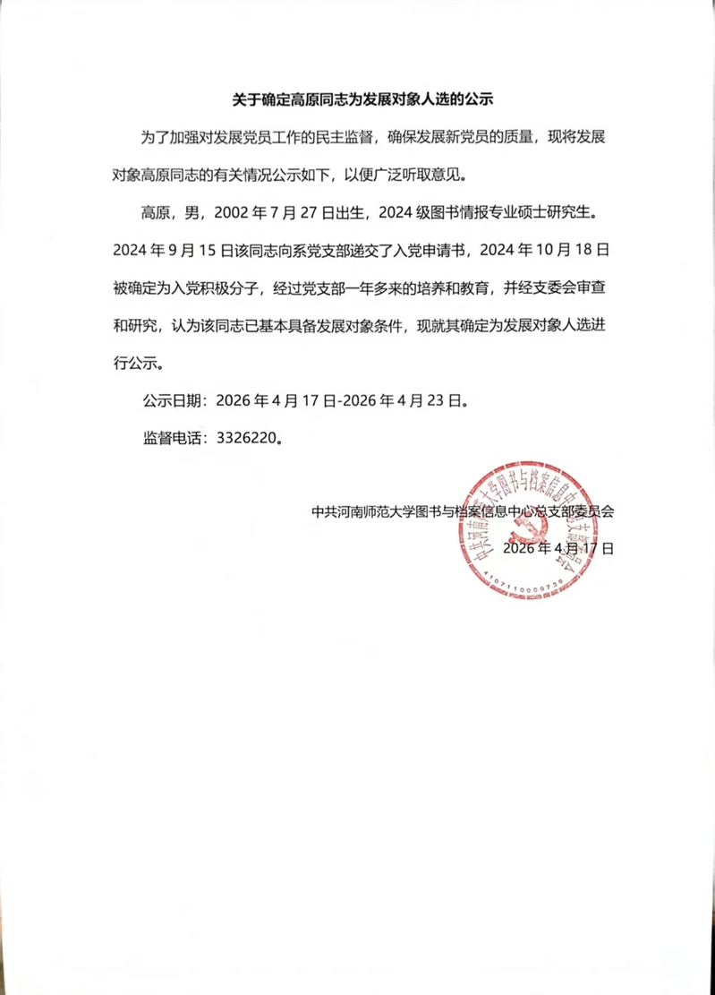 图书与档案信息中心2026年上半年发展对象公示