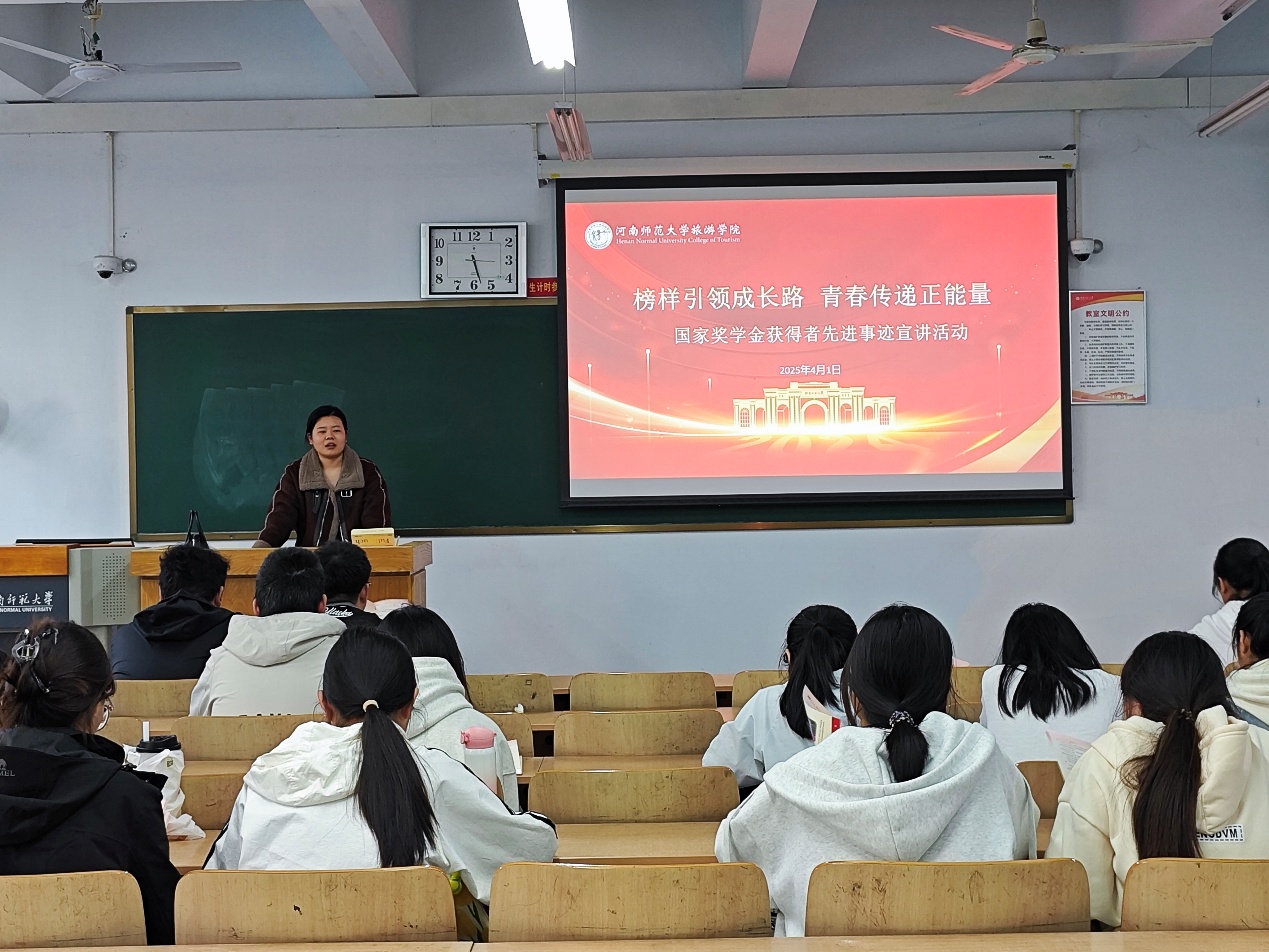 为发挥榜样示范力量,传递积极向上、奋发有为的学习氛围。4月7日下午,河南师范大学旅游学院 “榜样在身边”宣讲活动在启智楼104教室顺利召开。本次会议由2024级专职辅导员闫依铭主讲,2024级全体学生干部和宿舍长参与本次活动。