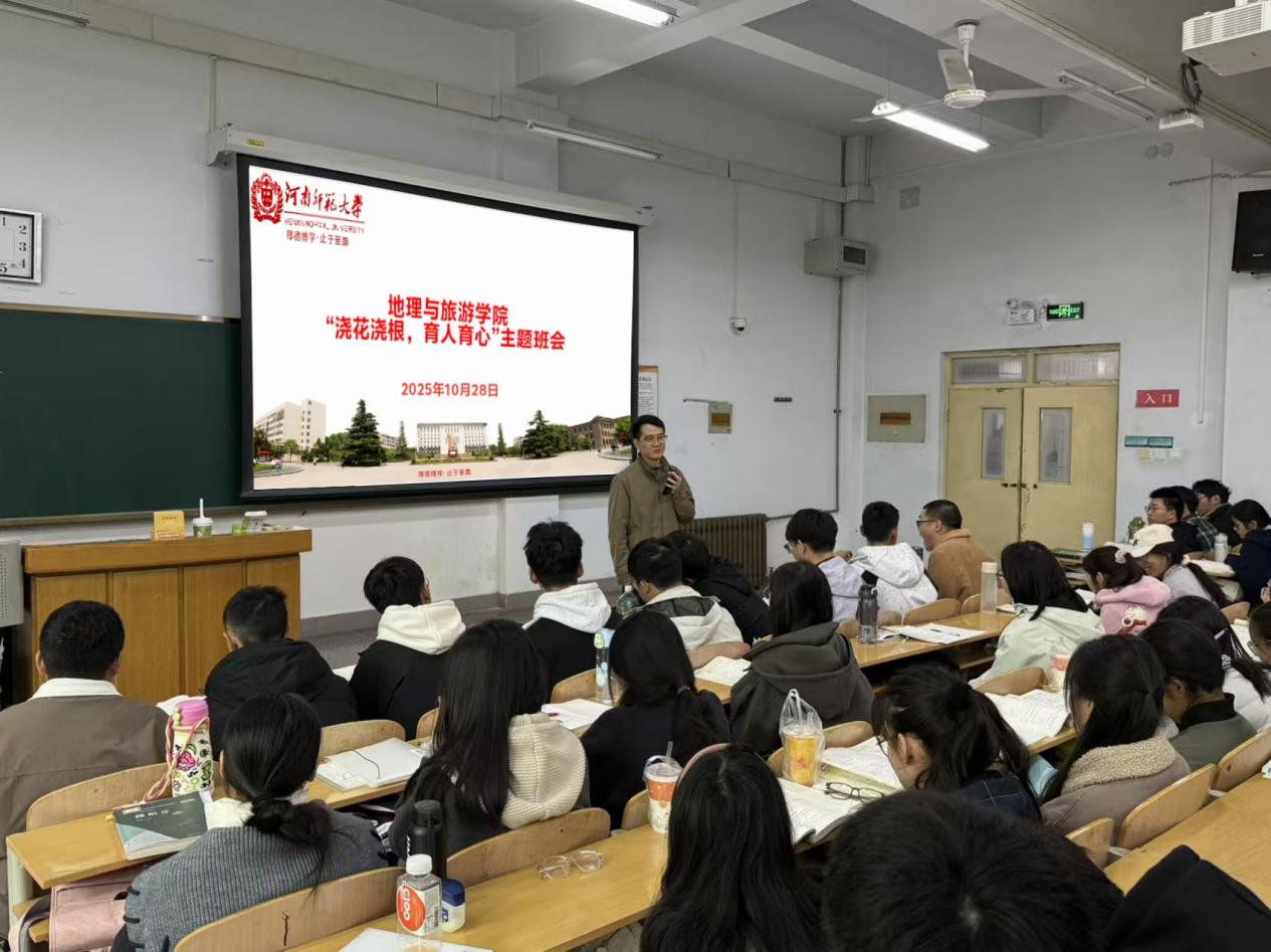本次主题班会形式多样,内容丰富。各年级通过主题演讲、案例分享及互动讨论等多个环节将爱党爱国、思想引领、学业规划、心理健康、职业发展等核心内容融入其中。2023级专职辅导员黄昭组织同学们进行互动讨论,他建议大家结合自身发展与个人兴趣特长,认真描绘个人大学成长路线图,把专业学习与社会需求紧密结合,将来在地理科学、旅游管理、文化传播等领域主动担当。2025级专职辅导员张志明鼓励同学们敞开心扉,畅谈学业上的困惑、生活中的烦恼以及对未来的憧憬,并给予大家耐心的解答和积极的引导。“这次班会让我感觉特别温暖,老师不是在讲大道理,而是真正在关心我们的内心想法和长远发展。”2025级的一位同学在会后分享道,“‘浇根’和‘育心’这个比喻非常贴切,让我明白了扎实学习和健康心理同样重要,对未来方向也更清晰了”。