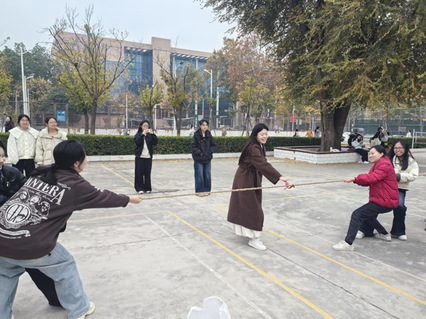 比赛期间,现场气氛热烈高涨。同学们按要求分成若干小组,赛前相互鼓劲、商讨战术;赛场之上,大家紧握长绳、身体后倾,随着闫依铭“比赛开始”口号的一声令下,大家齐声发力,脸颊涨红却目光坚定,脚下的步伐整齐划一。场外同学自发组成啦啦队,呐喊声、加油声此起彼伏,为参赛队员注入源源不断的动力。过程中,无论是领先时的乘胜追击,还是胶着时的坚持不懈,同学们始终秉持“友谊第一、比赛第二”的原则,彼此包容、互相支持,每一组对决都充满了团结的暖意。