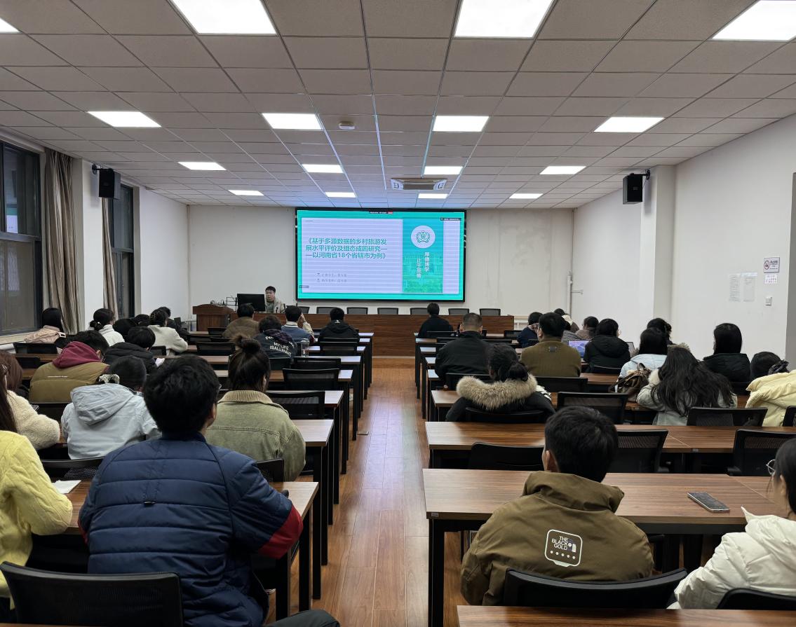 随后,董方超同学汇报了《基于多源数据的乡村旅游发展水平评价及组态成因研究——以河南省18个省辖市为例》。该研究融合遥感数据、社交媒体数据与统计数据,构建乡村旅游发展水平评价体系,运用组态分析法探究不同驱动因素的协同作用路径,揭示资源禀赋、基础设施、政策支持与市场活力之间的多重并发关系,识别出高发展水平的典型模式组合,为区域乡村旅游差异化发展提供实证依据与政策启示。