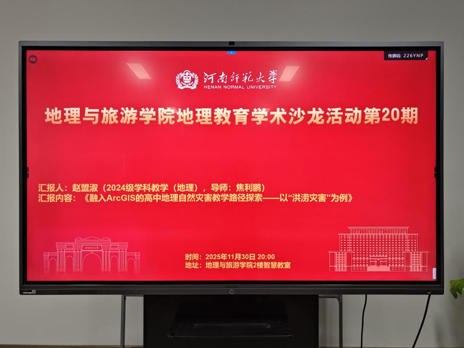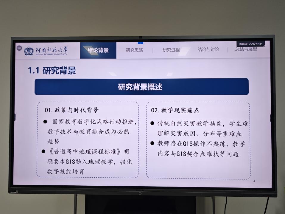 赵盟淑同学以《融入ArcGIS的高中地理自然灾害教学路径探索——以“洪涝灾害”为例》为题,研究已发表的优秀论文,系统阐述了数字技术赋能地理教学的具体路径。该研究直面传统自然灾害教学中知识点抽象、学生理解困难以及教师GIS技术应用门槛高等现实痛点。汇报明确了ArcGIS在破解灾害成因、空间分布及风险评估等教学重难点方面的独特优势。研究核心部分呈现了以“杭州洪涝灾害”为真实情境的完整教学案例,围绕“致灾因子—孕灾环境—承灾体—防灾减灾能力—综合风险”五大维度,设计了“识灾情、探灾由、寻减灾”三级探究任务链,通过引导学生实际操作DEM数据等方法制作专题图,将抽象知识转化为可视化、可交互的探究过程,有效培养了学生的区域认知、综合思维和地理实践力等核心素养,同时为一线教师提供了数据来源、操作步骤清晰的可落地方案,显著降低了技术应用门槛,为推进地理教育数字化转型提供了有价值的理论与实践参考。