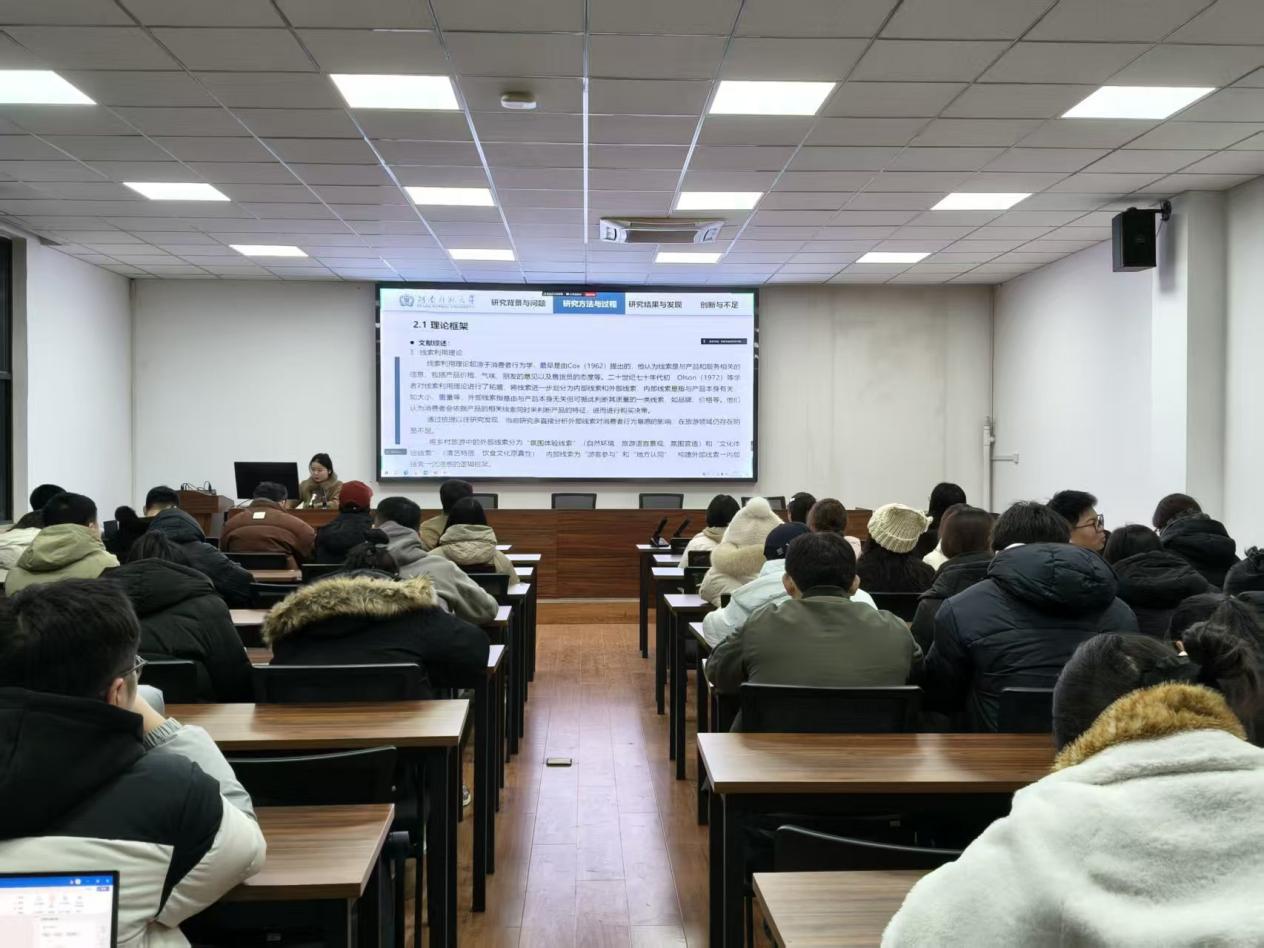 首先,柴晓雪同学围绕《乡土文化重构中游客沉浸感的生成机制研究》这一主题,从乡土文化当代转化的现实语境切入,系统阐释了游客沉浸体验的形成路径与关键因素,为理解文旅融合中的情感联结提供了新的分析视角。随后,王浩鑫同学以《叙事、俗信与旅游:生活传承论视野下的地方传说实践——基于淇县朝歌文化园的调查》为焦点,通过淇县朝歌文化园的生动案例,剖析了地方传说在当代旅游场域中被讲述、信仰与活用的具体实践,展现了传统文化在日常生活中的延续与创新。