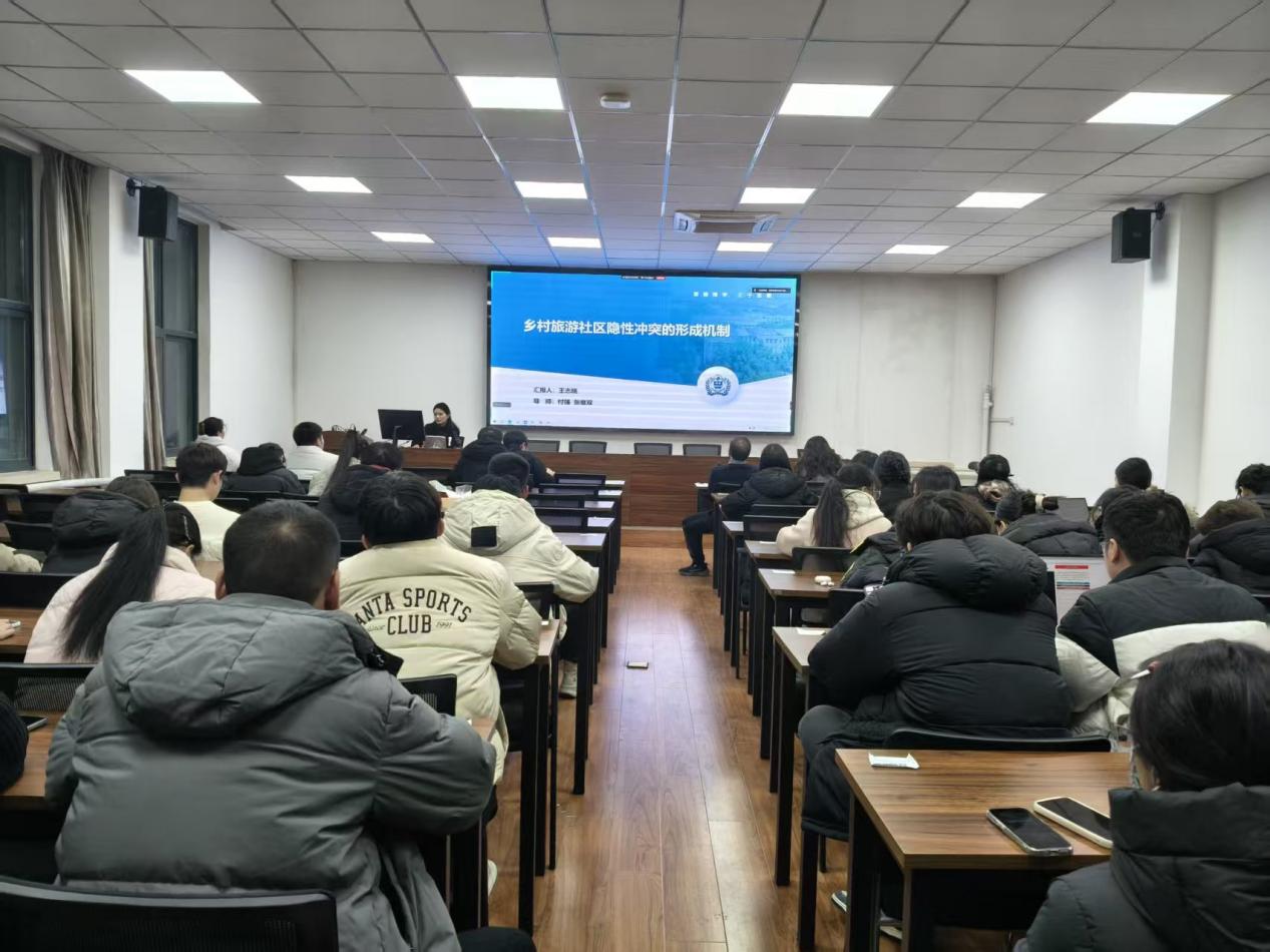 随后王志瑞同学汇报了《乡村旅游社区隐性冲突的形成机制》,该研究基于社会冲突理论与社会资本理论,系统探讨了乡村旅游发展中社区内部隐性冲突的形成机制。研究指出,隐性冲突发生于冲突五阶段模型的早期,尚未外显为公开行为;其形成与演进主要受到社会资本流失的驱动,具体表现为制度规范失序、关系信任瓦解以及社区参与网络脱嵌。这三个维度的社会资本衰退相互交织,逐步引发居民在认知、情绪与意图上的对立,从而催化并延续了社区内的隐性冲突。该研究通过混合方法揭示了“社会资本流失—隐性冲突演进”的内在路径,为预防和化解乡村旅游社区的深层矛盾提供了理论依据与实践启示。