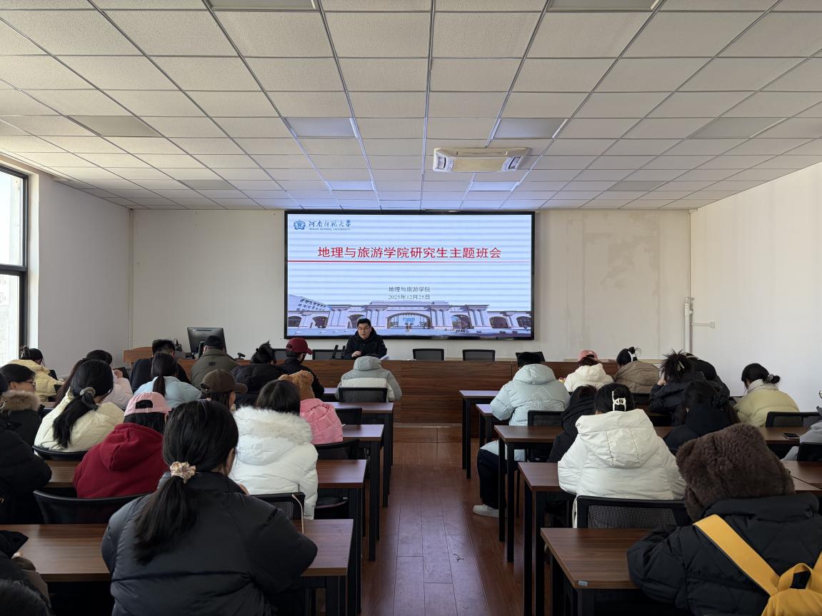 12月25日下午,地理与旅游学院2025年研究生年终主题班会在行知大讲堂三楼举行。班会采用线上线下相结合的方式进行,学院全体研究生共同参与,班会由研究生辅导员尉富国主持。