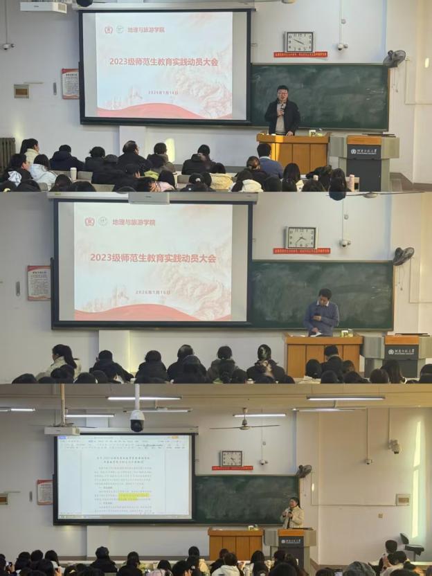 为明确2026年教育实习目标、任务与要求,增强学生安全意识,1月16日下午,地理与旅游学院在新554楼303教室隆重召开2023级地理师范专业教育实习动员大会。学院党委副书记孙晓、副院长付强、辅导员黄昭、实习实训主任耿妍、实习指导教师以及2023级即将赴实习基地开展师范实习的共计195名学生共同参加会议。