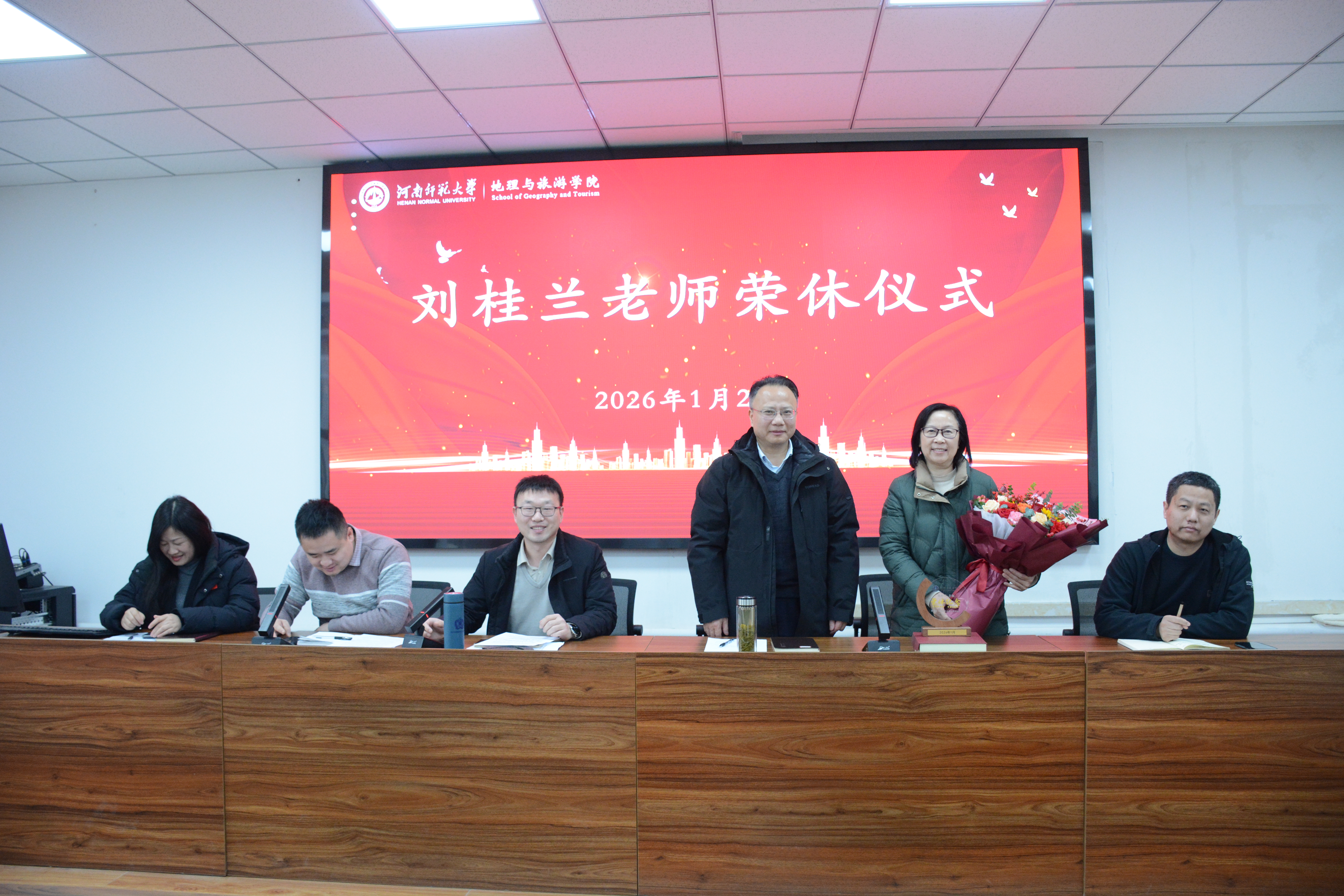 一支粉笔两袖风,三尺讲台四季晴。1月29日上午,地理与旅游学院在琢玉楼行知大讲堂举行了一场隆重而温馨的荣休仪式,向为学院建设与发展深耕数十载的刘桂兰老师致以崇高敬意。学院党政领导班子成员及全体教职工齐聚一堂,共话离别情谊,同叙育人佳话,见证这一光荣时刻。仪式由学院党委副书记、分工会主席孙晓主持。