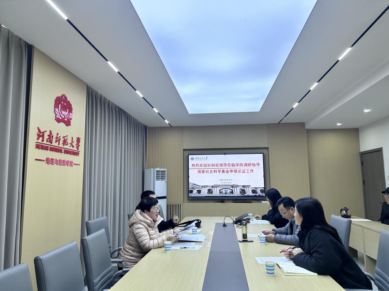 3月2日上午,学校社会科学处处长赵黎波教授、副处长张继汝教授一行来到地理与旅游学院调研,就2026年度国家社会科学基金项目的申报论证工作进行专题指导。会议在学院一楼综合教研室召开,学院党委书记冯峰、副院长王二红等参加了会议。