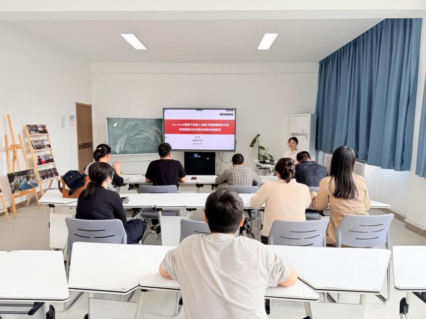会议伊始,田雅老师就其申报的国家自然科学基金项目主要内容进行汇报。她从全球新发传染病频发、人兽共患病风险加剧的背景切入,阐释了One Health理念的研究价值,介绍了项目的研究目标、核心内容、技术路线及前期研究基础。交流研讨环节,与会教师围绕项目内容展开深入讨论,从跨学科数据整合、技术路线、模型适用性、成果应用场景等多个维度提出了富有建设性的完善建议,为项目进一步优化提供了多元视角与务实路径。
