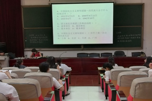 此次笔试竞答分为客观题和主观题两部分,采取ppt放映方式答题,力求方便快捷高效。活动伊始,各位答题者胸有成竹地坐在座位上准备答题。随后答题开始,此次客观题主要围绕团旗的形象与意义、团员的权利与义务、如何才能成为一名合格的共青团员提问,参赛选手们针对这些问题积极思考,认真答题,争取答出水平,答出质量。学习团章知识是增强团员意识教育活动的一部分,而增强团员意识的教育活动是对保持党员先进性教育活动的延拓。答题过程中,学生不急不躁,从容不迫,从这种答题情况可以看出,他们积极学习过团章知识,并对团章知识有着深刻的理解。共青团是祖国的未来,祖国的希望,从学生身上我们看到坚决拥护中国共产党的领导,解放思想,实事求是,与时俱进的当代大学生形象。在笔试结束后,有学生表示作为一名新一代的大学生,作为一名团员,我们要从细节做起,从点点滴滴做起,不断提高自身的综合素质。祖国的统一与强大,都离不开现代的大学生,离不开当代的共青团员,我们应意识到并担当起这份重任。