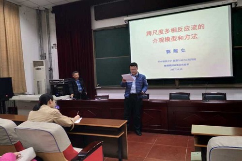 讲座伊始,郭照立教授简要介绍其团队所研究的“跨尺度多相反应流”课题,他分别从研究背景、重要进展、学术影响三个方面进行详细说明。接着,他讲解了由跨尺度多相流现象而提出基于流体离散本质的介观理论和方法。随后,郭照立教授阐述其团队在跨尺度流动理论框架、跨尺度多场耦合的介观模型等方面取得的跨越性进展。最后,郭教授强调数学在研究领域的发挥着不可忽视的重要作用。本次讲座在热烈的掌声中结束。