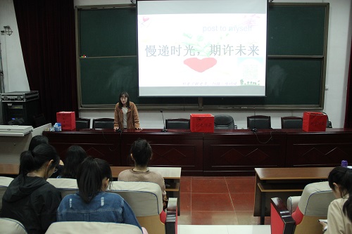 活动伊始,2016、2017级学生代表上台发言并分享个人的学习生活经验。其中,学生代表白孟瑶嘱咐新生要尽早定下目标 ,确定将来发展的大致方向,这样才不会使自己感到迷茫。孟佳琳用“人把自己置身于忙碌当中时,有一种麻木的踏实,但丧失了真实”这句话告诫新生应该利用空闲时间做一个规划,而不是每天毫无目的地忙碌着。学生代表郑皓则建议新生在学好专业课的同时,可以多了解一些人文方面的知识来充实自己,适当的出去旅游开拓自己的视野,了解其他城市的发展。在场新生纷纷表示在此次活动中受益匪浅,在未来的学习生活中也会坚定目标,努力奋进。最后,由各班心理委员向时光信箱中投放了学生信件。活动在热烈的掌声中落下帷幕。