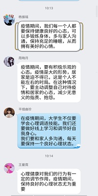 此次活动以班级为单位,学院组织学生线上观看心理健康专题报告视频,视频中,中国科学院院士、北京大学第六医院院长陆林老师针对大家在疫情期间如何保持一个健康的心理状态,提出了 “了解疫情不恐慌、规律作息多锻炼、自觉学习不荒废、调整情绪善发泄”的建议;针对疫情防控期间心理疏导,推介各种心理调适方法,引导学生妥善应对心理行为波动,高效利用时间学习以及培养自身爱好,学生们听过之后感悟颇深。而后,各班学生就报告中的内容展开了热烈讨论,积极发表自己的观后感受与想法,学生们开始重视自我存在的心理问题,学会适应疫情期间的各种变化。活动取得圆满成功。