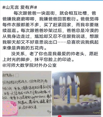 本次活动分为“抒发真情,献上贺卡”和“关于成长,关于父爱”两个部分。活动中,同学们借助QQ空间平台讲述自己与父亲之间独一无二的故事,同时展示出了自己亲手制作的精美贺卡,传达自己对父亲的感激之情,流露出了对父亲的真挚情感。此外,部分同学以父亲节为背景抒写关于父亲的原创文章,同学们以笔为纽带,将自己浓烈的情感通过笔墨传达至书信中,在字里行间里回忆父亲与自己的点点滴滴,表达自己理解父亲,愿意守护父亲的动人情感。