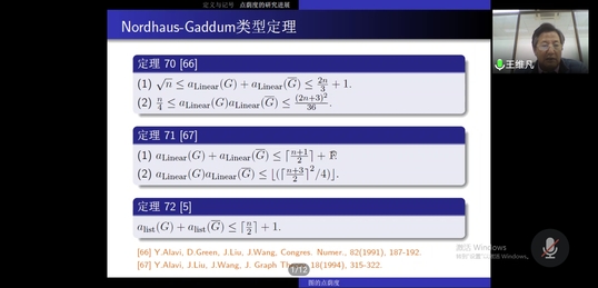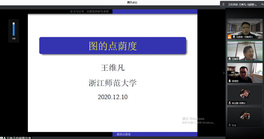 12月10日下午,应数学与信息科学学院邀请,浙江师范大学博士生导师王维凡教授通过“腾讯会议”软件平台作了题为“Vertex Arboricity of Graphs”的线上学术报告。学院组合图论方向教师和研究生共20余人聆听了本次讲座,报告会由马迎宾副教授主持。